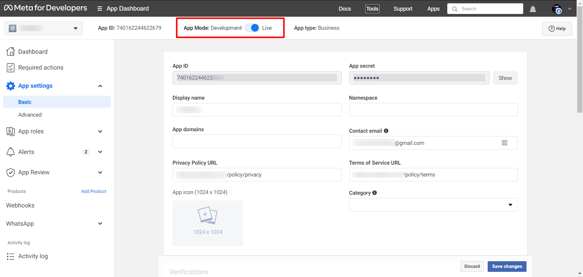 Then from the App settings, click on the Basic option and add the Privacy Policy URL and Terms of Service URL from the InstaVega. These URLs are available on the Connect bot page of InstaVega. After adding these URLs just click on the “Save changes” button.