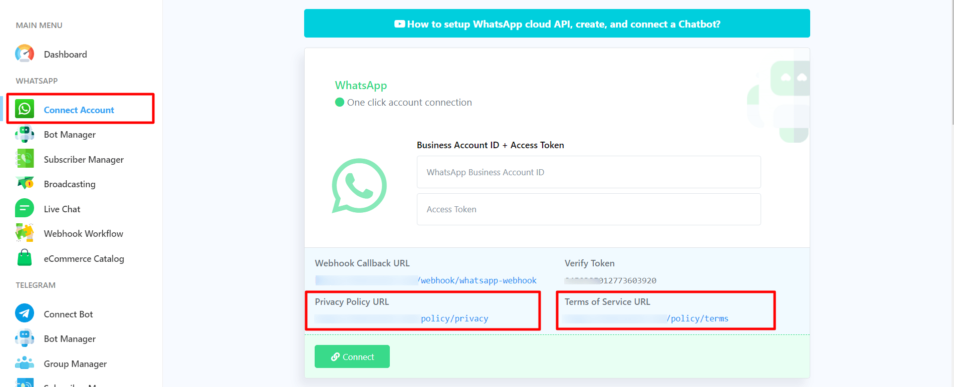 To get the callback URL and verify the token from InstaVega. Login to your account and go to the dashboard of InstaVega. At the left sidebar of the Dashboard, under the WhatsApp section, you will see connect WhatsApp option. Now click on the connect WhatsApp menu and instantly, Connect WhatsApp Business page will appear.